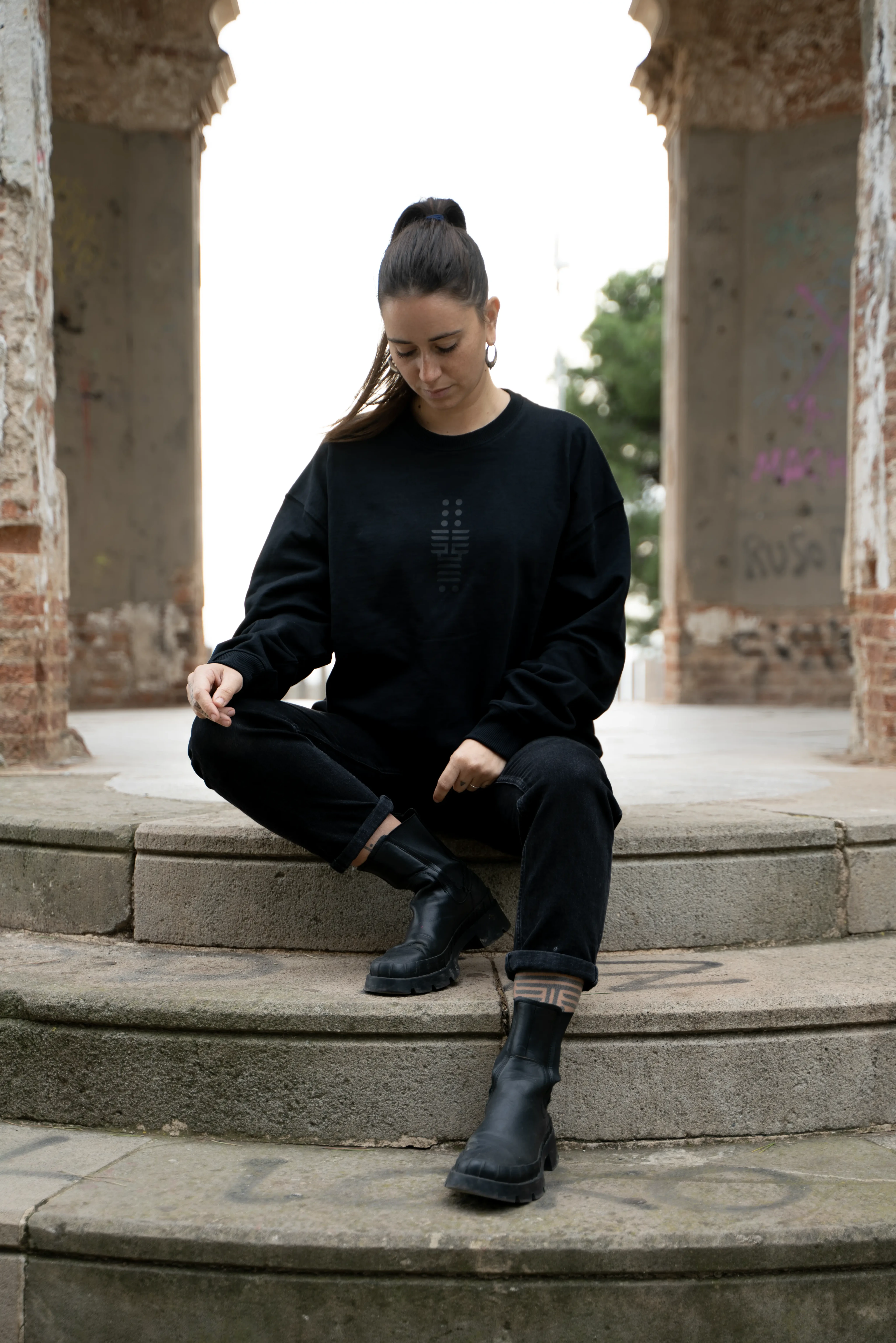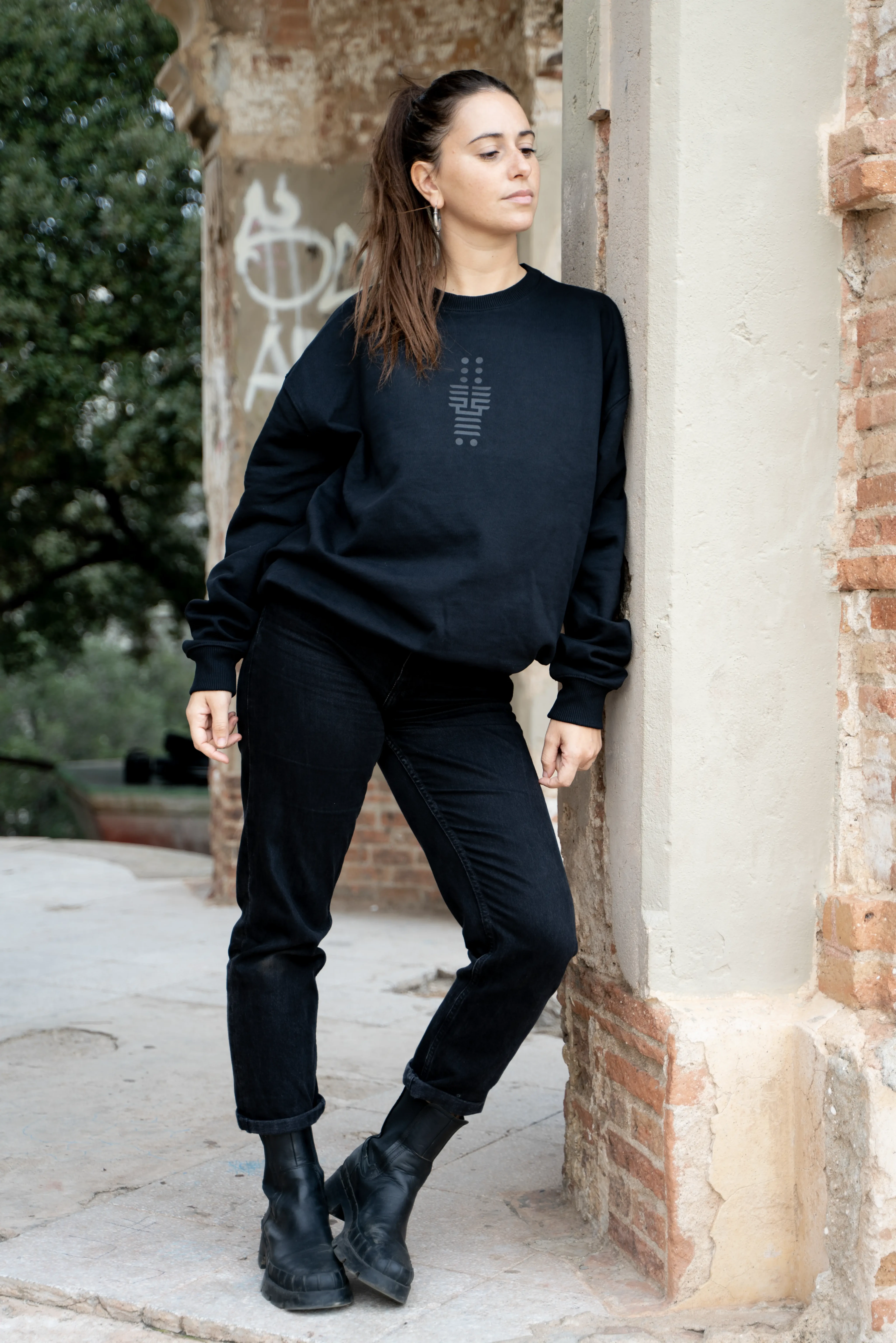 Black on black screenprinted on 100% Cotton – Organic Carded Dry Handfeed